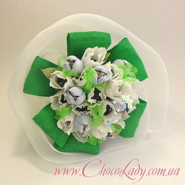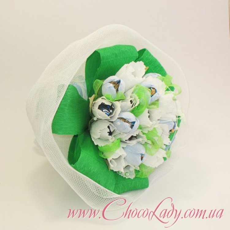 Букет із цукерок - оригінальний подарунок на 8 березня Тюльпани - 15 шт. Крокуси – 8 шт. Склад цукерок та гамма кольорів можуть бути змінені під клієнта.