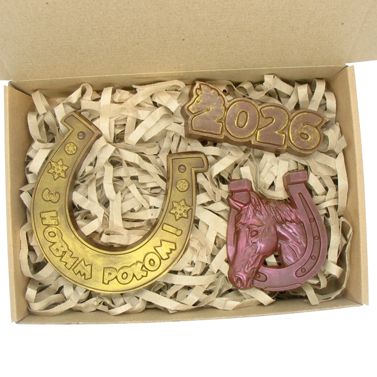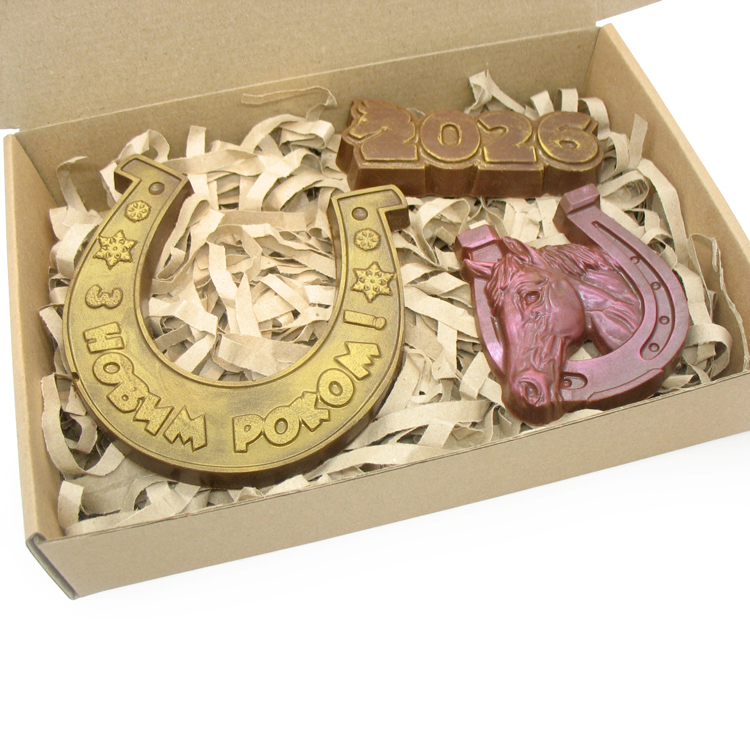 Подаруйте близьким та колегам шматочок удачі разом з оригінальним шоколадним набором із підкови з конем, маленької підковки та цифр 2026 року.