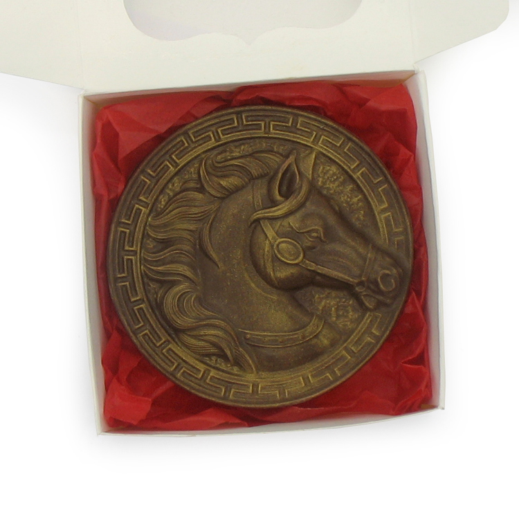 Ми виготовили її із справжнього бельгійського шоколаду, приділивши увагу кожній деталі рельєфу. Акуратна форма медалі та витончене зображення коня перетворюють ласощі на маленький шедевр.
