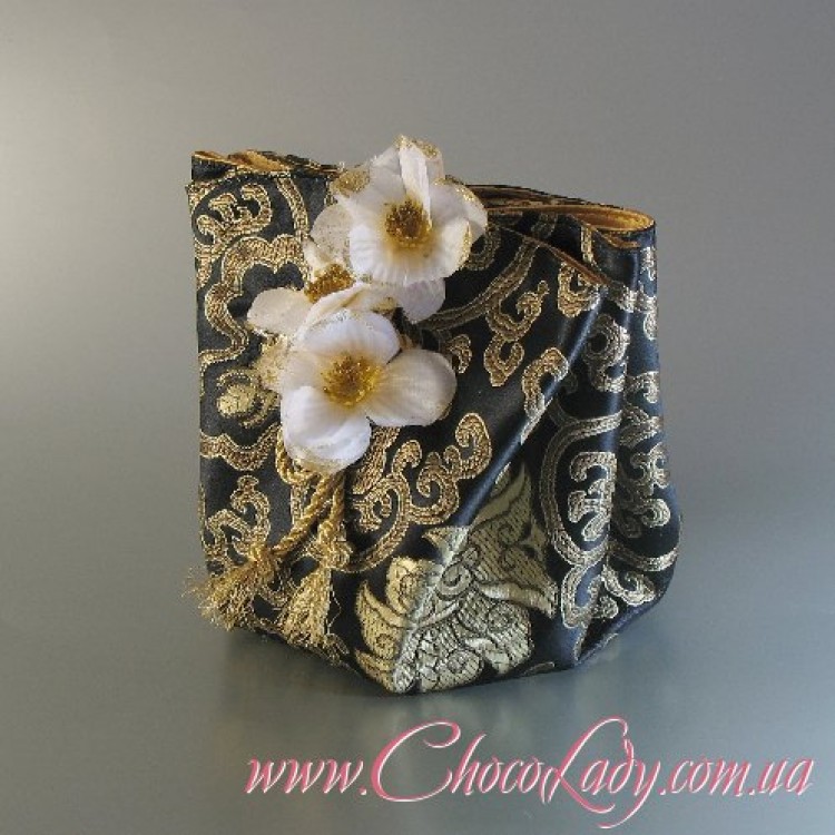 Подарункова упаковка у вигляді чоловічого радикюлю, виконаного з парчі чорного кольору із золотим малюнком та декорована золотим шнуром та білими квітами.
